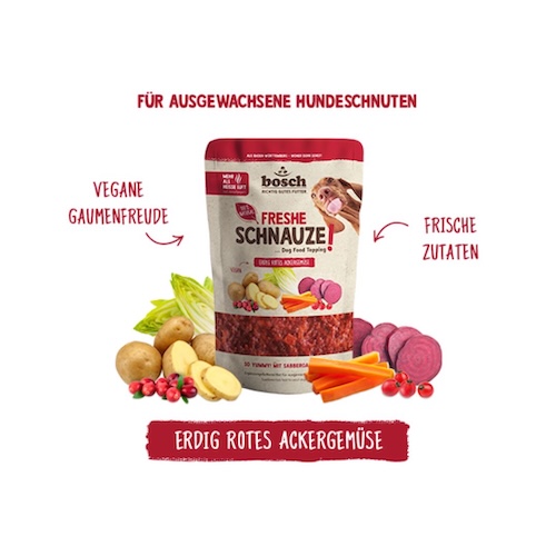 Das Freshe Schnauze Topping – Erdig rotes Ackergemüse von Bosch Tiernahrung ist eine frische, vegane Ergänzung für die tägliche Fütterung ausgewachsener Hunde. Der schonend dampfgegarte Gemüsemix aus Roter Bete, Karotten, Kartoffeln und Hagebutten sorgt für eine schmackhafte und abwechslungsreiche Aufwertung jeder Mahlzeit.
