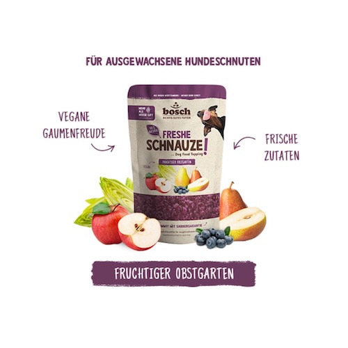 Das Freshe Schnauze Topping – Fruchtiger Obstgarten von Bosch Tiernahrung ist eine frische, vegane Ergänzung für die tägliche Fütterung ausgewachsener Hunde. Der schonend dampfgegarte Fruchtmix aus Äpfeln, Birnen und Blaubeeren sorgt für eine fruchtige Abwechslung im Napf.