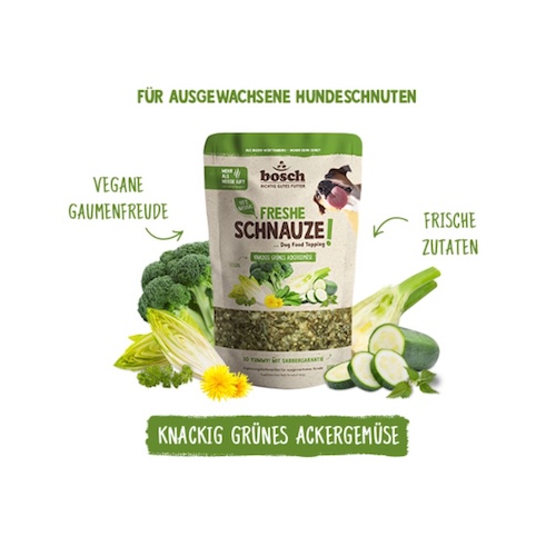 Das Freshe Schnauze Topping – Knackig grünes Ackergemüse von Bosch Tiernahrung ist eine frische, vegane Ergänzung für die tägliche Fütterung ausgewachsener Hunde. Der schonend dampfgegarte Gemüsemix aus Zucchini, Spinat, Brokkoli, Fenchel und Chicorée sorgt für eine abwechslungsreiche und schmackhafte Aufwertung jeder Mahlzeit.