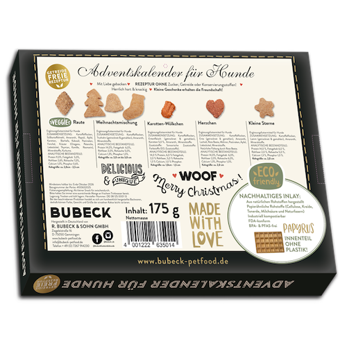Seit 1893 steht BUBECK für Qualität und natürliche Tiernahrung. Auch bei diesem besonderen Adventskalender, der die Bindung zwischen Mensch und Hund stärkt. Ob als Belohnung, Trainingshilfe oder kleine Aufmerksamkeit: jeden Tag ein wohltuender Moment im Advent.