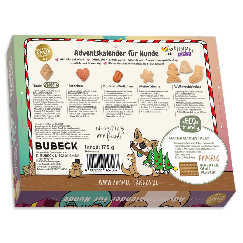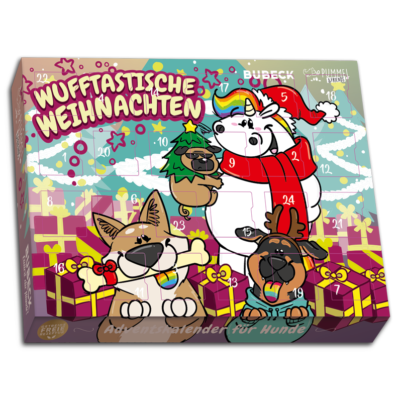 Die Weihnachtszeit wird für deinen Hund mit dem BUBECK & Pummeleinhorn Adventskalender zu einem echten Erlebnis. Hinter jedem der 24 Türchen verstecken sich liebevoll gebackene Leckerlies, die den Dezember Tag für Tag ein bisschen magischer machen.
