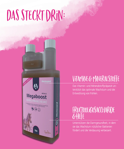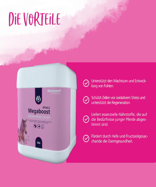 Mega Boost für Fohlen ist ein speziell formuliertes Vitamin- und Mineralstoffsupplement, das die optimale Wachstums- und Entwicklung von Fohlen unterstützt. Dieses umfassende flüssige Supplement liefert essentielle Nährstoffe, die auf die Bedürfnisse junger Pferde abgestimmt sind, und hilft ihnen, ihr volles Potenzial zu erreichen.