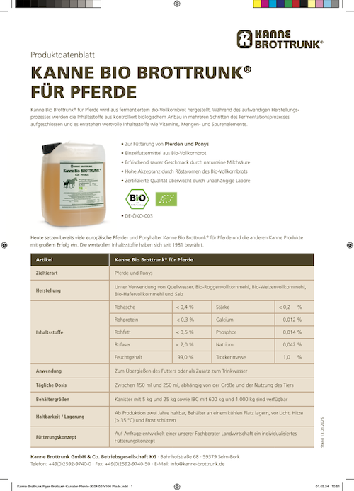 Kanne Bio Brottrunk® für Pferde ist ein fermentiertes Einzelfuttermittel aus Bio-Vollkornbrot. Der erfrischend saure Geschmack entsteht durch naturreine Milchsäure und wird durch feine Röstaromen besonders gut akzeptiert. Während des schonenden, mehrstufigen Fermentationsprozesses aus kontrolliert biologischem Anbau entstehen wertvolle Inhaltsstoffe bei gleichzeitig sehr niedrigem Brennwert (nur 3 kcal pro 100 ml).